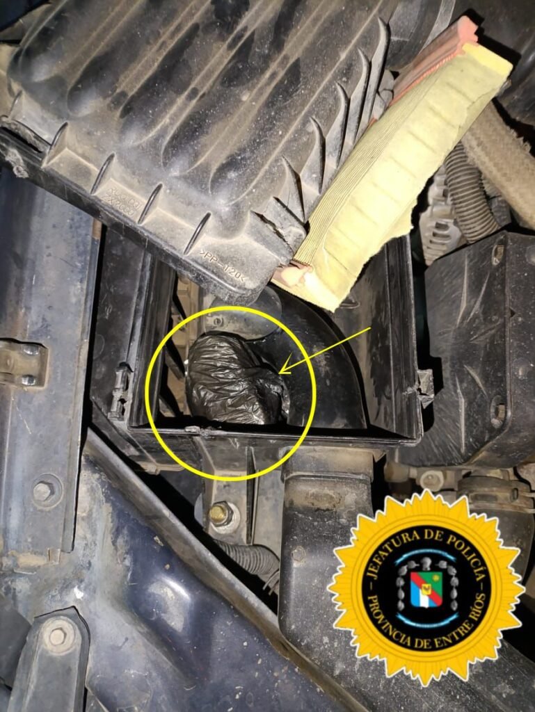 Una vez controlada la documental de rigor para circular, es que personal de este puesto de control vial solicita a dicho conductor que exhiba la parte posterior del vehículo denotando un nerviosismo en el sujeto, a raíz de ello es que el funcionario solicita la apertura del capot del vehiculo para controlar la numeración de Motor como asi tambien de chasis del rodado, luego realiza un pasaje con el can Narco detector “Jana” el cual demarca la posible presencia de material estupefaciente en la zona del motor y se observan anomalías en la caja porta filtros de aire del vehículo.