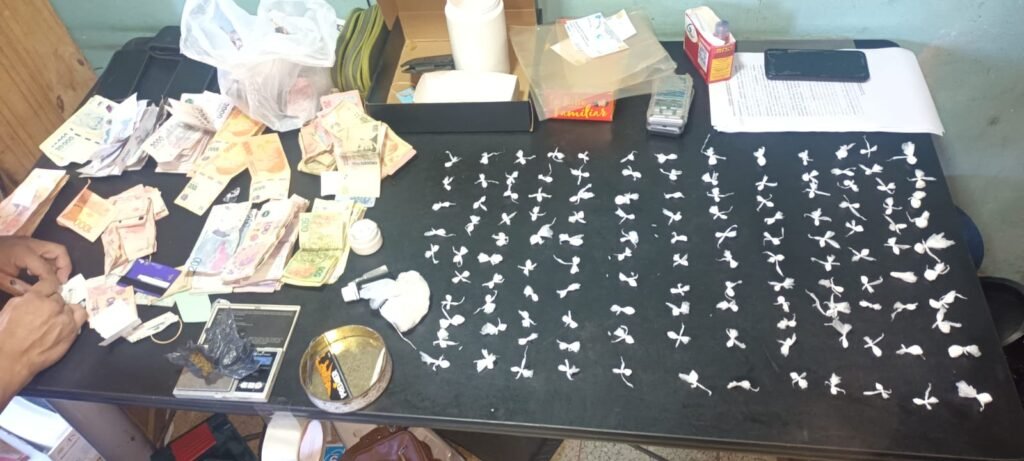Fue secuestrada cocaína compacta, todo con un peso de 117 grs.; (02) balanzas pequeñas; (02) envoltorios de marihuana con un peso de 3,7 grs; (02) plantas de marihuana de 2,10 mts., de altura, recortes de nylon y la suma de $665.500.